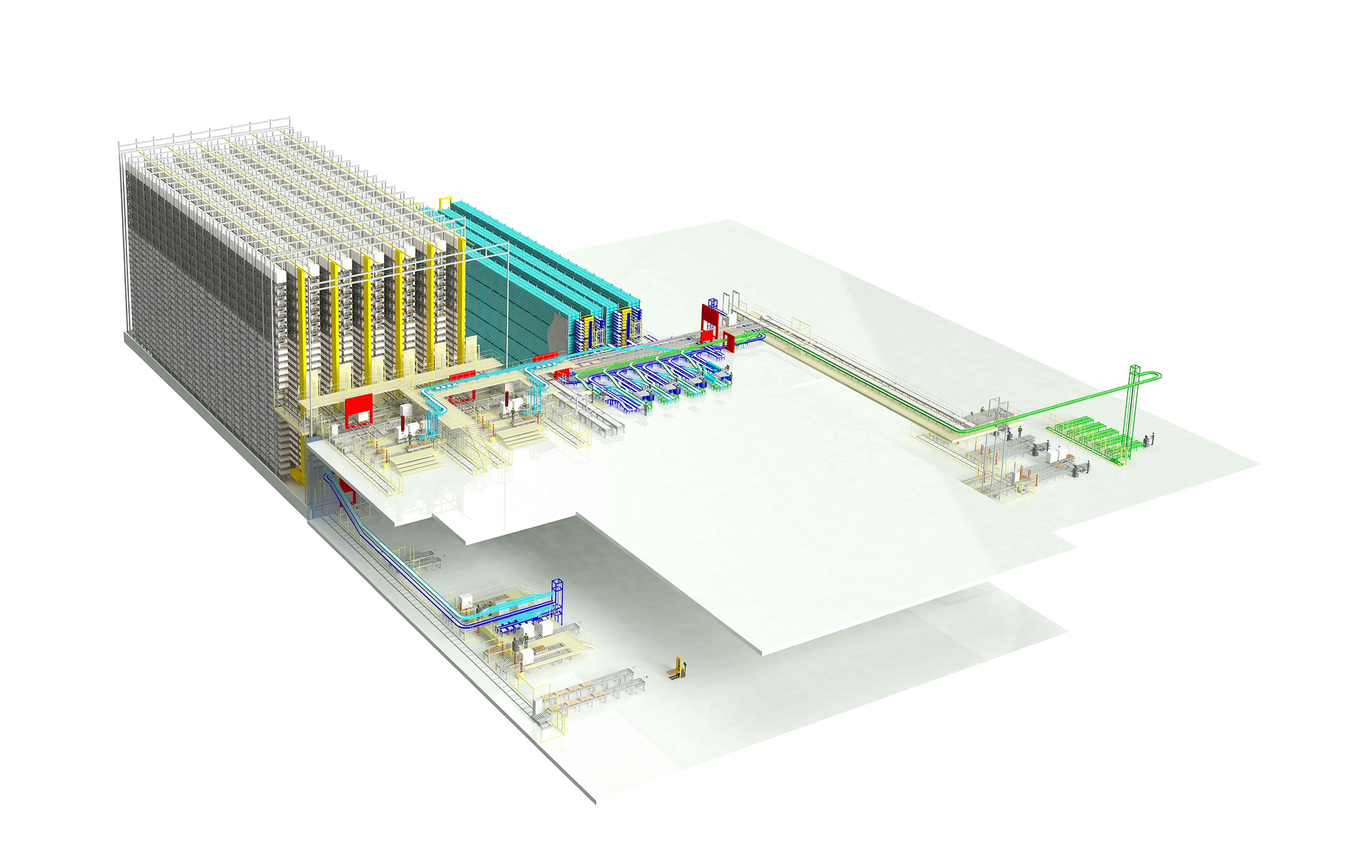 Hjertet i logistikkløsningen er et automatisert kranlager for pall med totalt 18 000 lokasjoner fordelt på 6 kranganger. Silobygget med 80 meter lengde, 75 meter bredde og en høyde på 30 meter, får en imponerende størrelse. I tillegg kommer et automatisert kasselager for småvarer med 2 ganger i trippel dybde – for totalt 40 000 kasser.