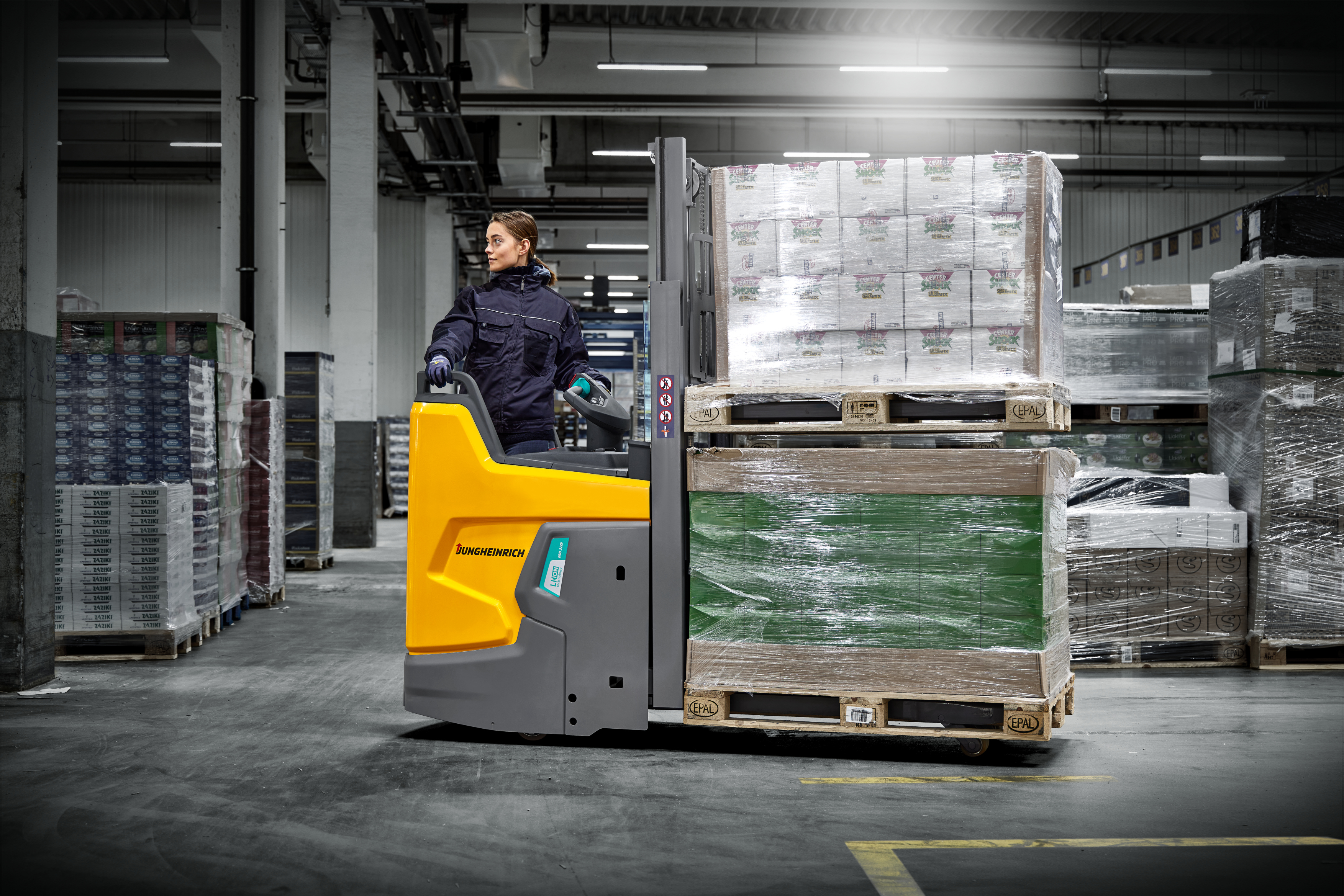 Den nye støttebenstrucken ERD 220i er designet for fleksibel bruk på lageret og for lasting og lossing av lastebiler. Lengden på trucken (l2-målet) på bare 1065 millimeter gjør trucken til den mest kompakte i sin klasse. Sammenlignet med forgjengeren er ERD 220i mer enn 300 millimeter kortere. Dette skyldes det nye litiumionbatterikonseptet, som resulterer i en plassreduksjon på omtrent 25 prosent. De kompakte dimensjonene gjør den elektriske palletrucken spesielt allsidig og smidig å kjøre. Svingradiusen har blitt redusert til bare 1985 millimeter. Dette gir mer ledig plass i eksisterende lagre og mer presis manøvrering der det er trangt. “ERD 220i gir maksimal utnyttelse av plassen. Den beskjedne svingradiusen gjør at trucken krever mindre plass i arbeidsgangene. Gangbreddene kan dermed reduseres, noe som betyr at vi kan tilby våre kunder som bruker ERD 220i mer lagringsplass på samme lagerflate", forklarer Torben Sell, ansvarlig produktsjef i Jungheinrich.